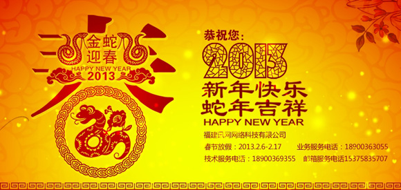 歲月如梭,一年一度的春節(jié)長(zhǎng)假又將來(lái)臨,值此新春佳節(jié)之際,福建訊網(wǎng)全體員工衷心感謝您在過(guò)去一年里對(duì)訊網(wǎng)的支持和信任,提前給各位新老朋友拜年,恭祝大家生意興隆、事業(yè)大吉、闔家歡樂(lè),蛇年吉祥!