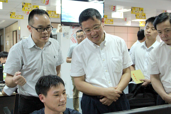 2015年8月19日下午,福建省委組織部常務(wù)副部長、非公企業(yè)黨工委書記袁毅,在中共泉州市委常委、組織部長陳沈陽,泉州市委組織部副部長張翼翔,豐澤區(qū)人民政府區(qū)長朱啟平,豐澤區(qū)委組織部長駱紅,領(lǐng)SHOW天地黨委書記鄭巍萍陪同下,蒞臨了訊網(wǎng)科技參觀考察。