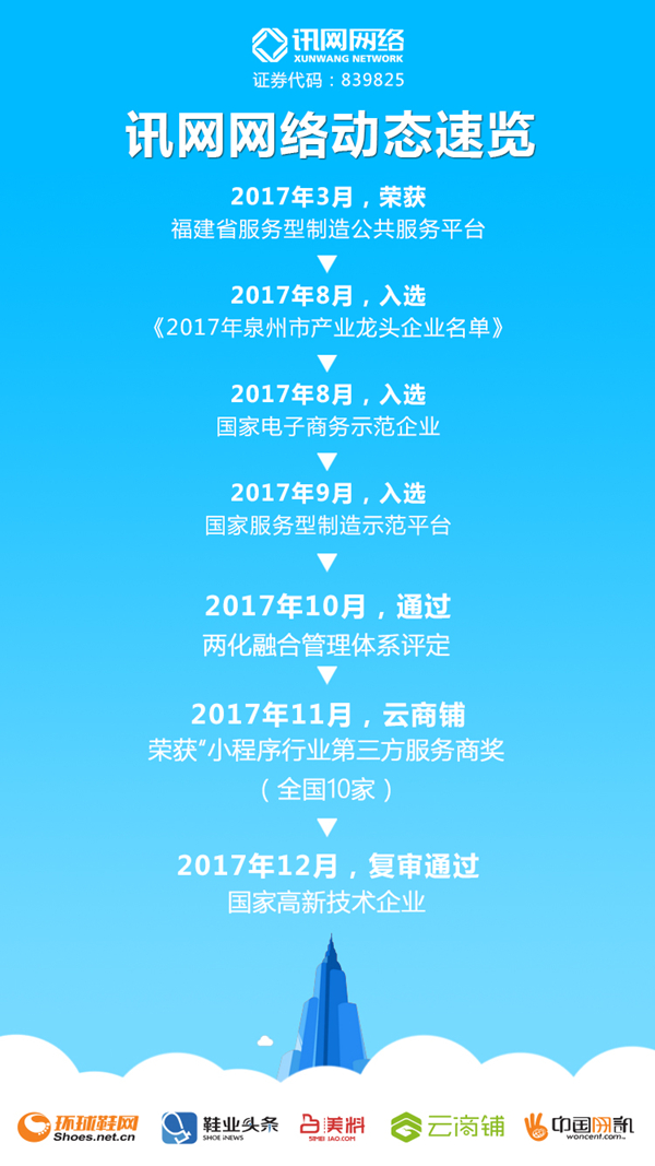 回首2017年,公司連續(xù)獲得國(guó)家電子商務(wù)示范企業(yè)和國(guó)家服務(wù)型制造示范平臺(tái)稱號(hào)。此次又獲得國(guó)家級(jí)高新技術(shù)企業(yè)的評(píng)定,是政府各職能部門對(duì)訊網(wǎng)網(wǎng)絡(luò)在科技研發(fā)工作中所取得成績(jī)的肯定與鼓勵(lì),同時(shí)也是對(duì)訊網(wǎng)網(wǎng)絡(luò)提出了更高的科研技術(shù)創(chuàng)新要求。